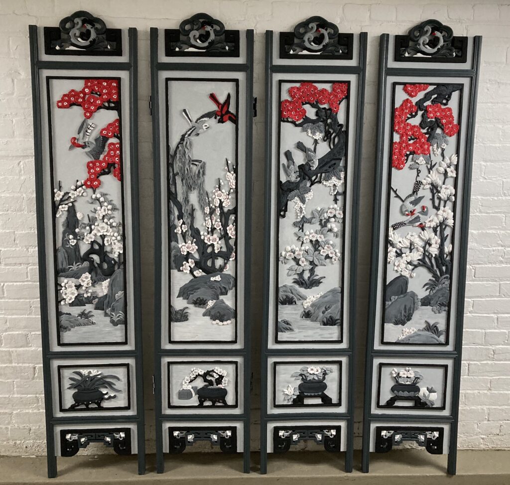 Une transformation de paravent venu d’ailleurs. Du noir au blanc, glissant vers un camaïeu de gris, et une pointe de rouge. Un vrai moment de plaisir, une métamorphose douce et poétique avec la belle surprise d’un résultat lumineux destiné à devenir tête de lit.